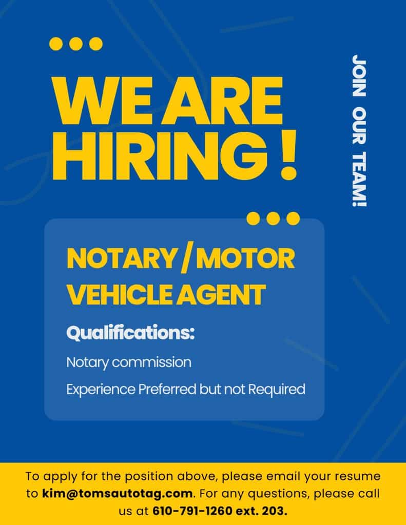 Look no further than Tom’s for a complete range of vehicle document services like auto tags and notary services.